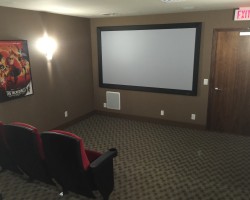 Our theatre features a widescreen with 16:9 aspect ratio (92 inches by 52 inches), surround sound system, DVD player (accommodates both blue-ray and traditional disks) with a projection system and seating for 7 people. Live TV is available in the theatre by way of Bell FIBE cable for enhanced enjoyment of sporting events, concerts and other live programs.